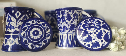 Handmade concave blue pottery mugs with lids | Bundle Deals 6 Mugs set | Tea, Coffee, Juice Mugs
