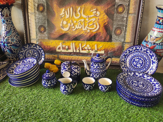 Ceramic Handmade Complete Tea Set with Serving Dinner / Rice Plates and Deep Plates [ qty 31 pcs] Design Ghauri