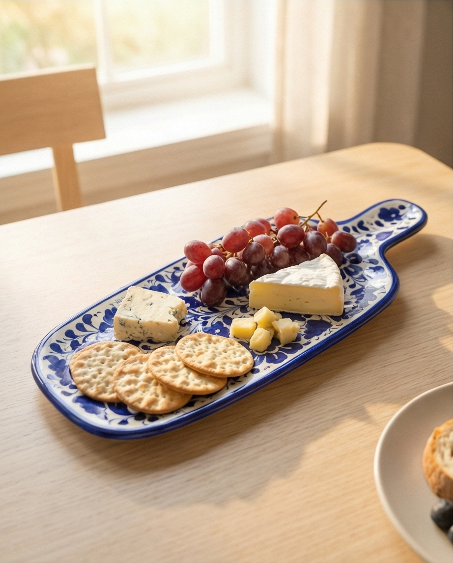 Elevate your morning ritual with the timeless elegance of handmade blue pottery. Perfect for cheese or breakfast treats. Shop this artisanal piece today.