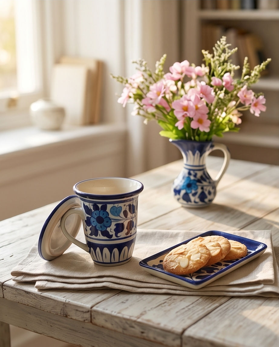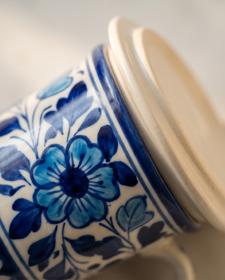 Elevate your tea ritual with our handmade ceramic set. Featuring two mugs with lids, a biscuit dish, and a matching vase. The perfect gift for refined tastes. Shop the collection now.